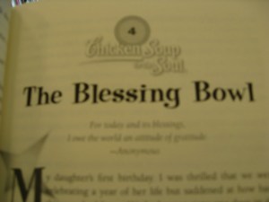 A couple months ago Chicken Soup for the Soul accepted her essay, The Blessing Bowl, to be printed in their book, Count Your Blessings! Today, the book was distributed. We are very excited to see Mama’s work printed in a book! This is also Mama’s first paid writing gig…which is exciting too!