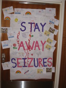 Samantha has received so many wonderful Children’s Hospital Cards from you all….well we just had to show them off; they now take residence on her door, with the sign. People stop to read ALL her messages…thank you.