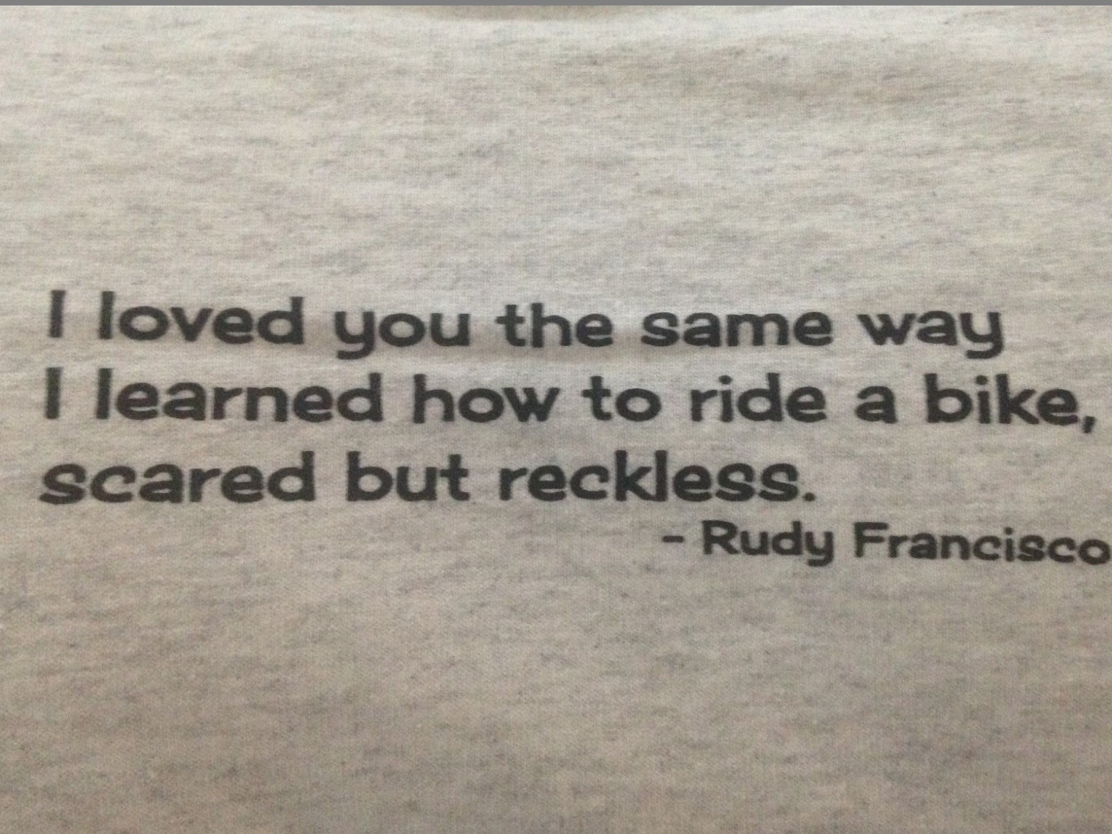 “But being in love is kind of like this. You could fall, you could get horrifically banged up, you WILL fall but you have to be reckless- you have to trust the bike.”